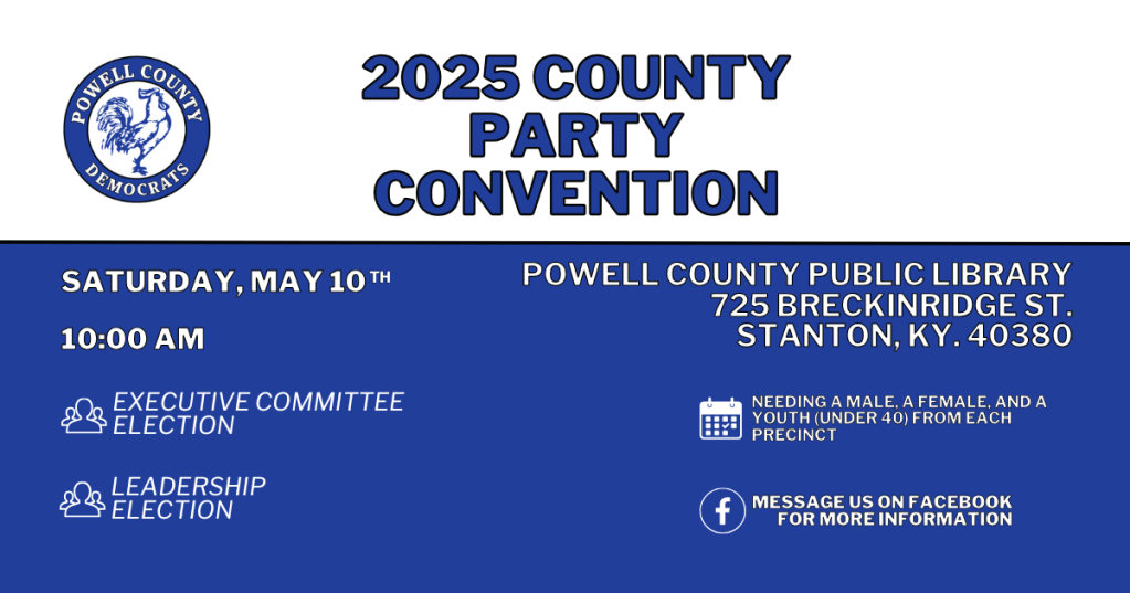 Calling all registered Democrats in Powell County! Come join us on May 10th at the Powell County Public Library as we hold our quadrennial County Party Convention. This is the process to elect your next County Executive Committee.